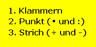 Zuerst etwas Grundsätzliches: Klammern werden immer zuerst ausgerechnet! Wenn keine Klammern da sind, gilt Punkt vor Strich! Das heisst, dass wir zuerst die Mal- und Geteiltdurch-Zeichen ausrechnen (wobei die Reihenfolge egal ist) und erst dann die Plus und Minus (wobei die Reihenfolge ebenfalls keine Rolle spielt)!