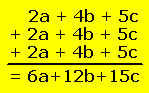 Wenn ein Faktor vor (oder in seltenen Fällen auch hinter) einer Klammer steht, multipliziert man diesen mit JEDEM Term, der sich in der Klammer befindet. Vorzeichen gelten dabei nach wie vor (Plus vor Klammer ändert nichts, Minus ändert alle Vorzeichen in der Klammer!). 3 * (2a + 4b + 5c) = 3 * 2a + 3 * 4b + 3 * 5c = 6a + 12b + 15c Zur Überprüfung: 3 * (2a + 4b + 5c) ist dasselbe wie (2a + 4b + 5c) + (2a + 4b + 5c) + (2a + 4b + 5c)