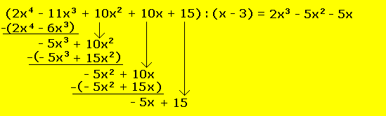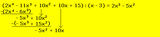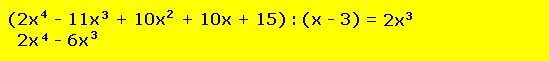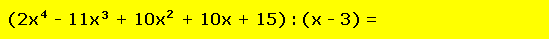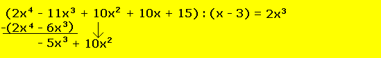 Faktorisiere den Term (2x4 - 11x3 + 10x2 + 10x + 15), wobei du bereits den Faktor (x - 3) kennst. Ausgangslage: