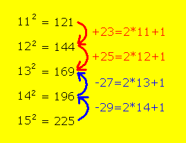 342 = ? Ich kenne die Quadratzahl des Nachfolgers: 352 = 1225 Ich subtrahiere den doppelten Nachfolger: 1225 - 2*35 = 1225 - 70 = 1155 Und schliesslich plus eins: 1155 + 1 = 1156 342 = 1156